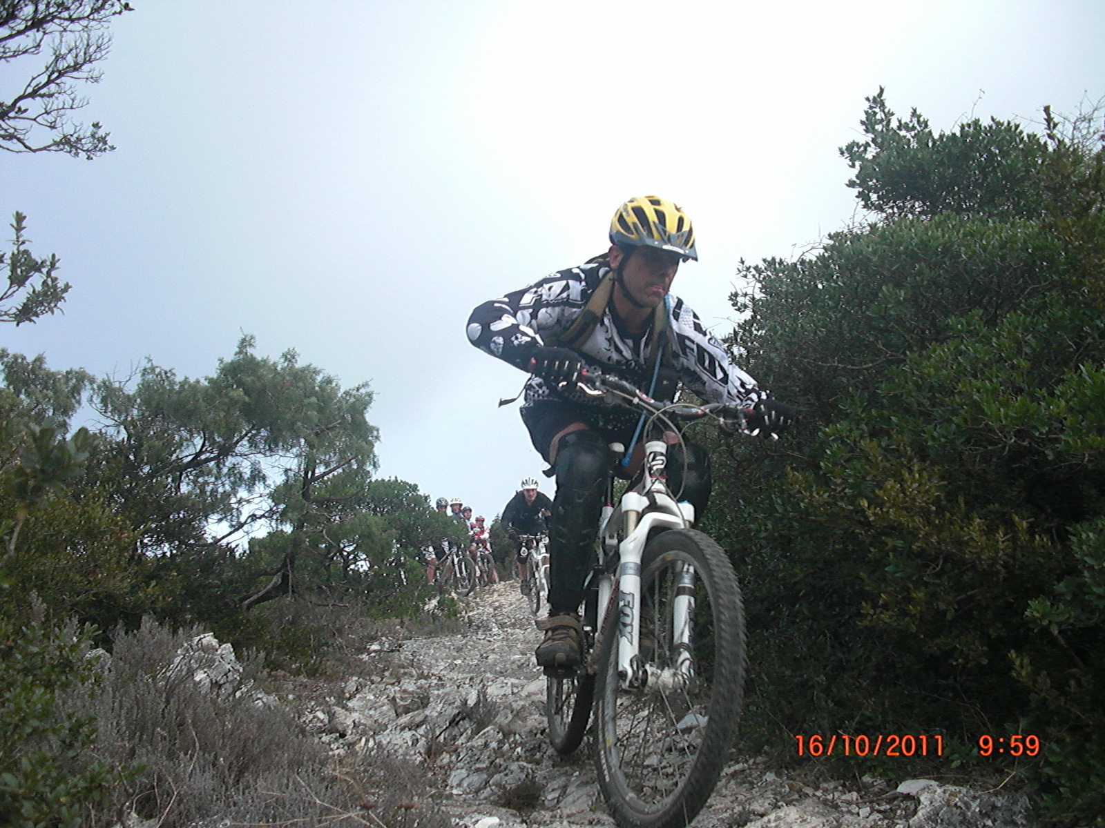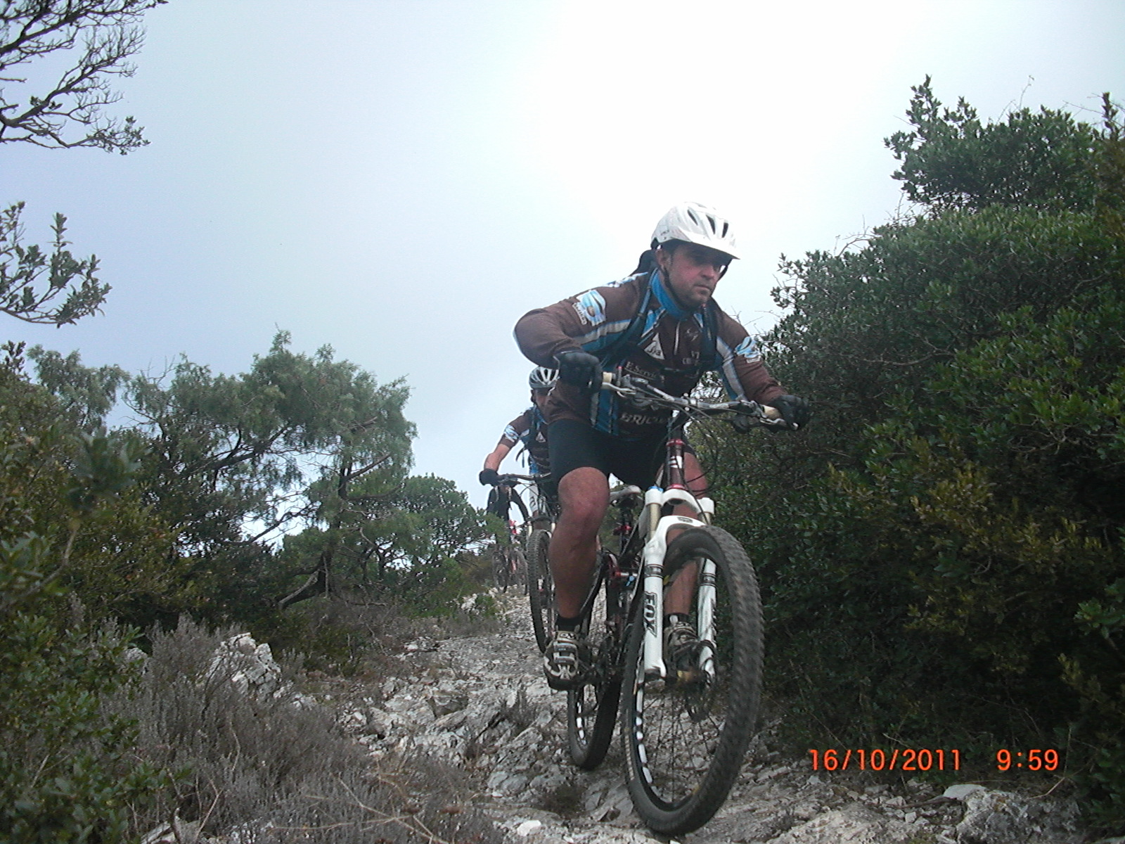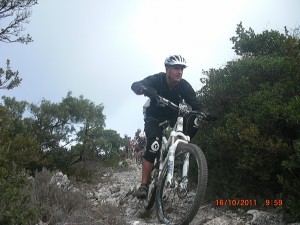 12 volontaires au départ avec un niveau relevé, sauf pour l ex beauf de Jacques : il nous fait une crevaison sur la piste………en fait il n a pas de canne et le pauvre il va souffrir car cela ne fait que commencer. Au pic de la Coquillade le temps se lève, cela nous permet d admirer la vallée. Dans la descente Éric, toujours le même ,dégaine son appareil photo et vidéo dans une partie très technique. Plus précisément sur une dalle rocheuse avec des marches dangereuses, abruptes, les premiers passent sur leur spad et les autres à pied……… Courage ça va venir, la suite ne peut pas s écrire cela elle se vit. En tronche (coupe du monde de rugby oblige…) mézigue, Philippe Brico et Francky BH FENDU on déballe à 3 cette descente à toute barzingue………… on en rigole encore tellement que c est bon l adrénaline à 200%. Encore ……