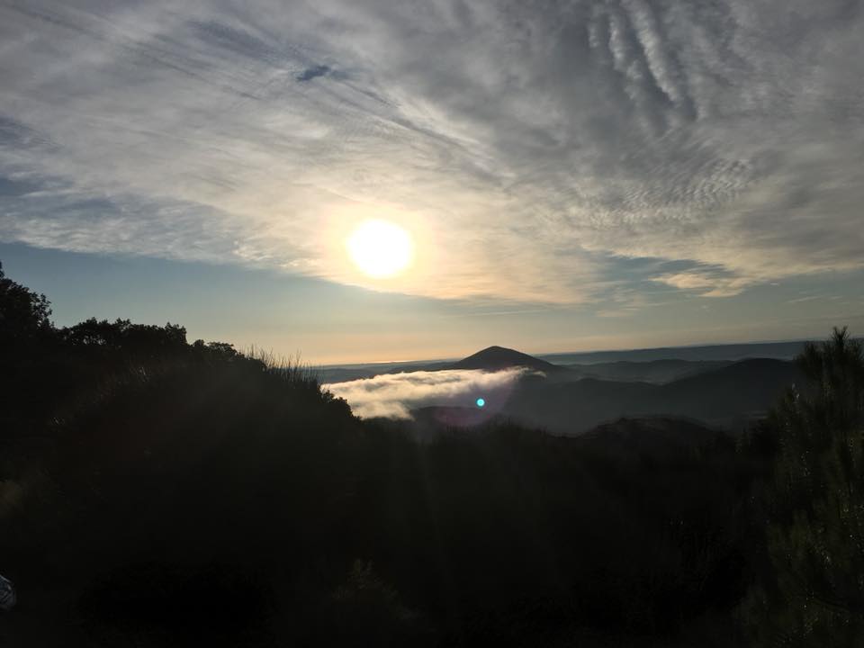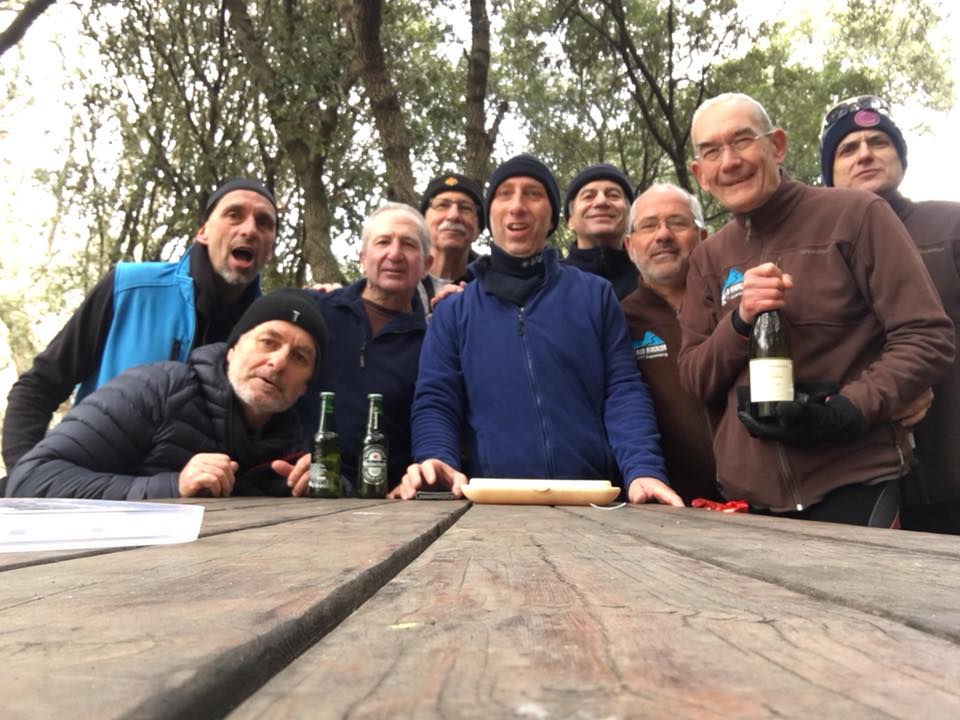 Par la piste cela aurait été trop simple : MDR propose une petite montée sympa, plus courte à partir de Mézeilles. Cet attardé de Bedeau trouve l’idée bonne : moralité, on s’est tapé un single joli comme tout, mais qui montait comme un escalier. Le Pèque en a perdu un ressort dans la bataille et le nôtre en a été quelque peu affaibli. Par contre, grosse récompense : à mi- pente, on surplombe la vallée de l’Orb d’où s’échappe une brume, qui suit fidèlement le tracé de la rivière comme un gros serpent d’ouate. Au fond, vers Agde et Sète le soleil embrase la grande bleue. On a profité de cette halte pour faire une photo de groupe que l’on enverra à notre amie Valérie, la reine de Sisteron. Passé la citerne, au col de la Bacoulette, poursuite de l’ascension vers les antennes, histoire de dire qu’il en fallait un peu plus.
